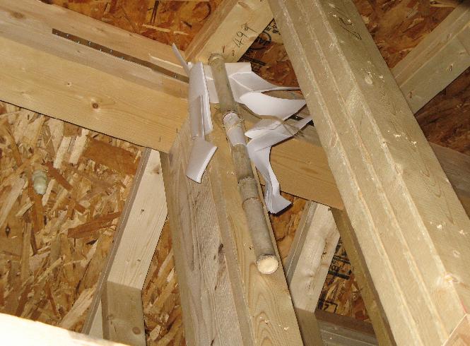 最後に、留さんが「地鎮祭のときのお札」を家の一番高いところに取り付けておしまい。